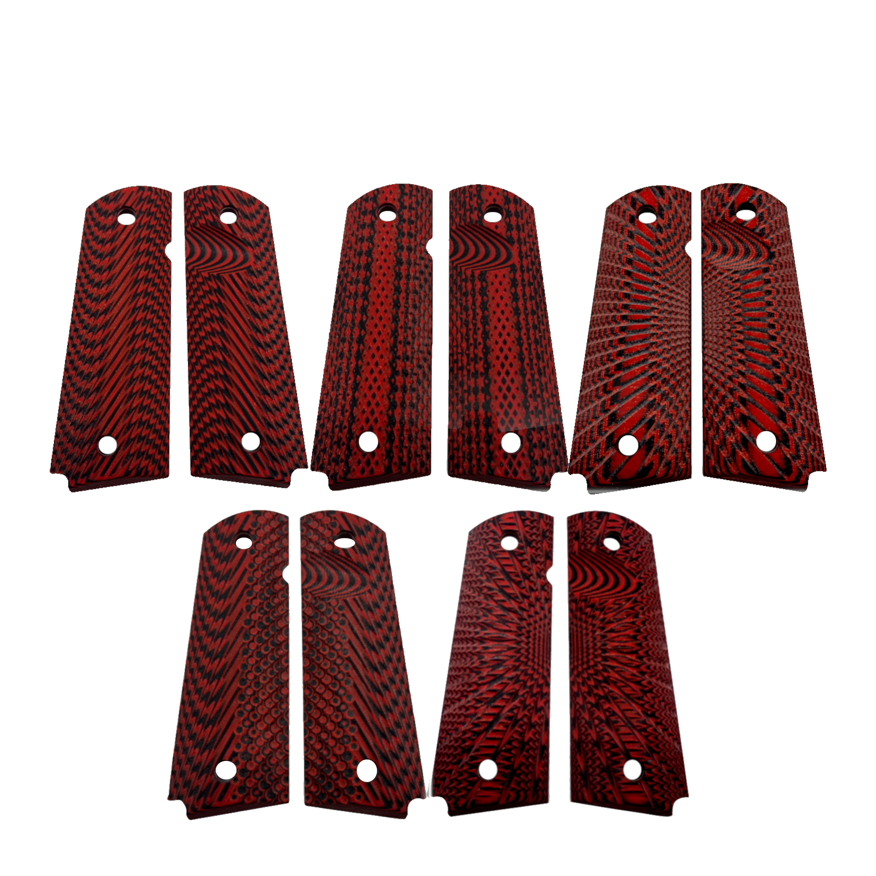 Key Features: - G10 Material Cross Hatch design, Ambi Notch Standard, CNC Machined, Fully De-horned, American Made. The Cross Hatch designed provides an medium-aggressive texture. They are made on a CNC mill out of a material called G10, which is one of the best materials for handgun grips and the only one that can provide this specific look. Its much tougher than wood or acrylic. It won't absorb moisture and doesn't scratch very easily. The material is tough as nails and will last normal shooters a life time.