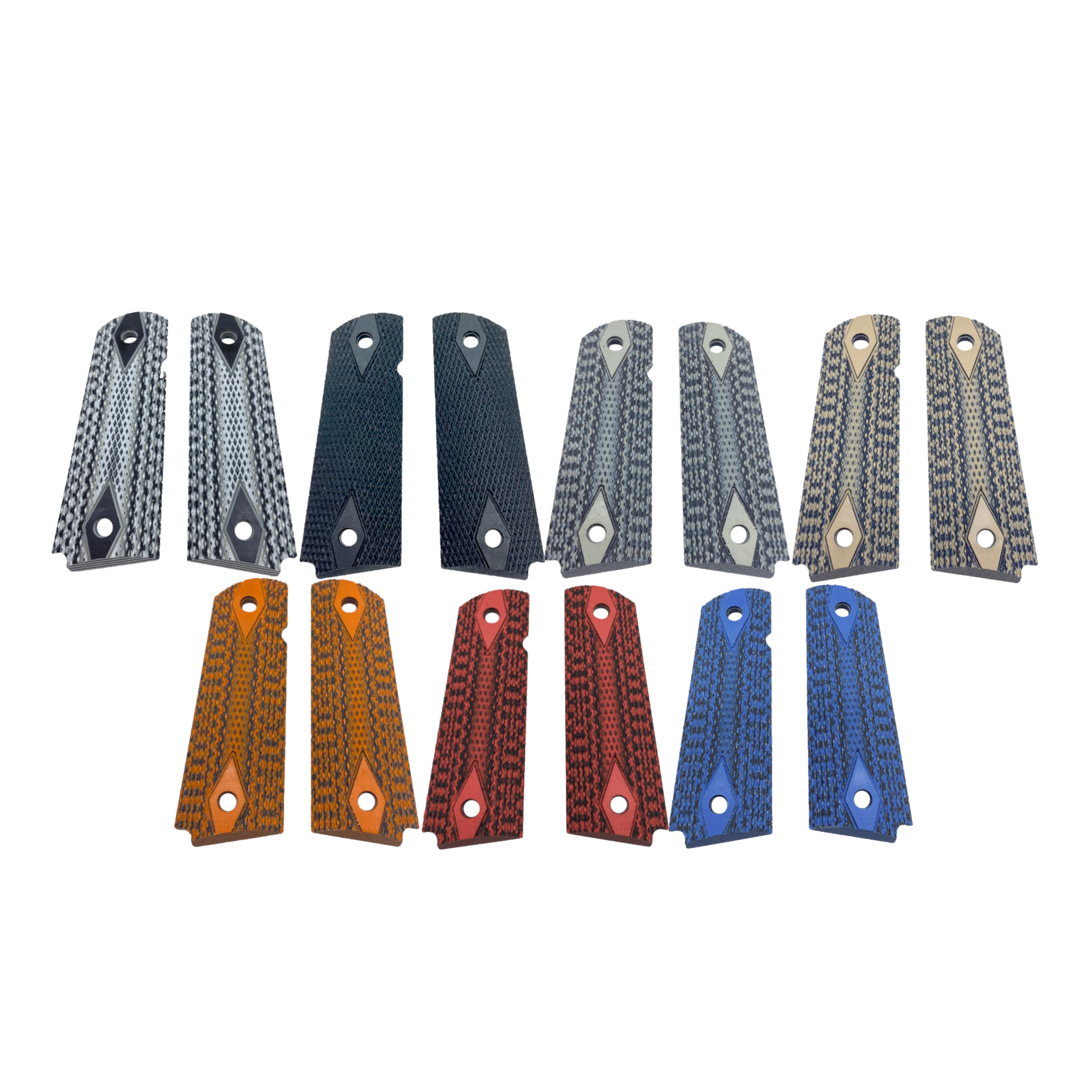 Key Features: - G10 Material Double Diamond Design, Ambi Notch Standard, CNC Machined, Fully De-horned, American Made. The Double Diamond design provides a fairly aggressive texture. WE DO NOT recommend the Tactical Magazine Release for this design. They are made on a CNC mill out of a material called G10, which is one of the best materials for handgun grips and the only one that can provide this specific look. Its much tougher than wood or acrylic. It won't absorb moisture and doesn't scratch very easily. The material is tough as nails and will last normal shooters a life time.