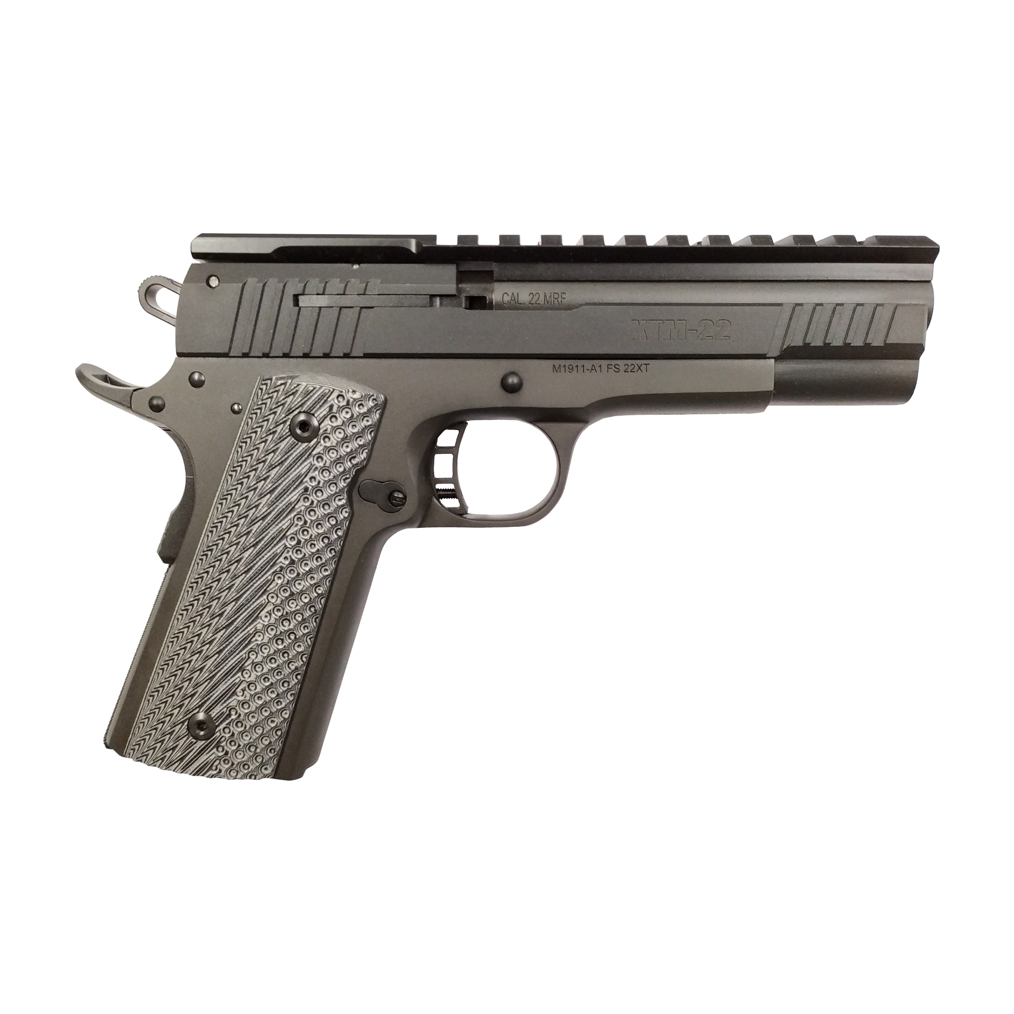 OVERVIEWYou asked. We delivered more. 1911 Pro that packs the powerful 22 magnum cartridge with a 14-round capacity. Engineered with a pinned, solid state 5" inch fixed exposed bull barrel with tactical rail mounted on top with delayed blow back slide, factory 4- to 6-pound trigger to offer match class accuracy and power. Includes skeletonized hammer and trigger with adjustable over travel stop. The XT Magnum is finished with rock-tough parkerized coating, fitted G10 grips and comfort extended beaver tail safety.