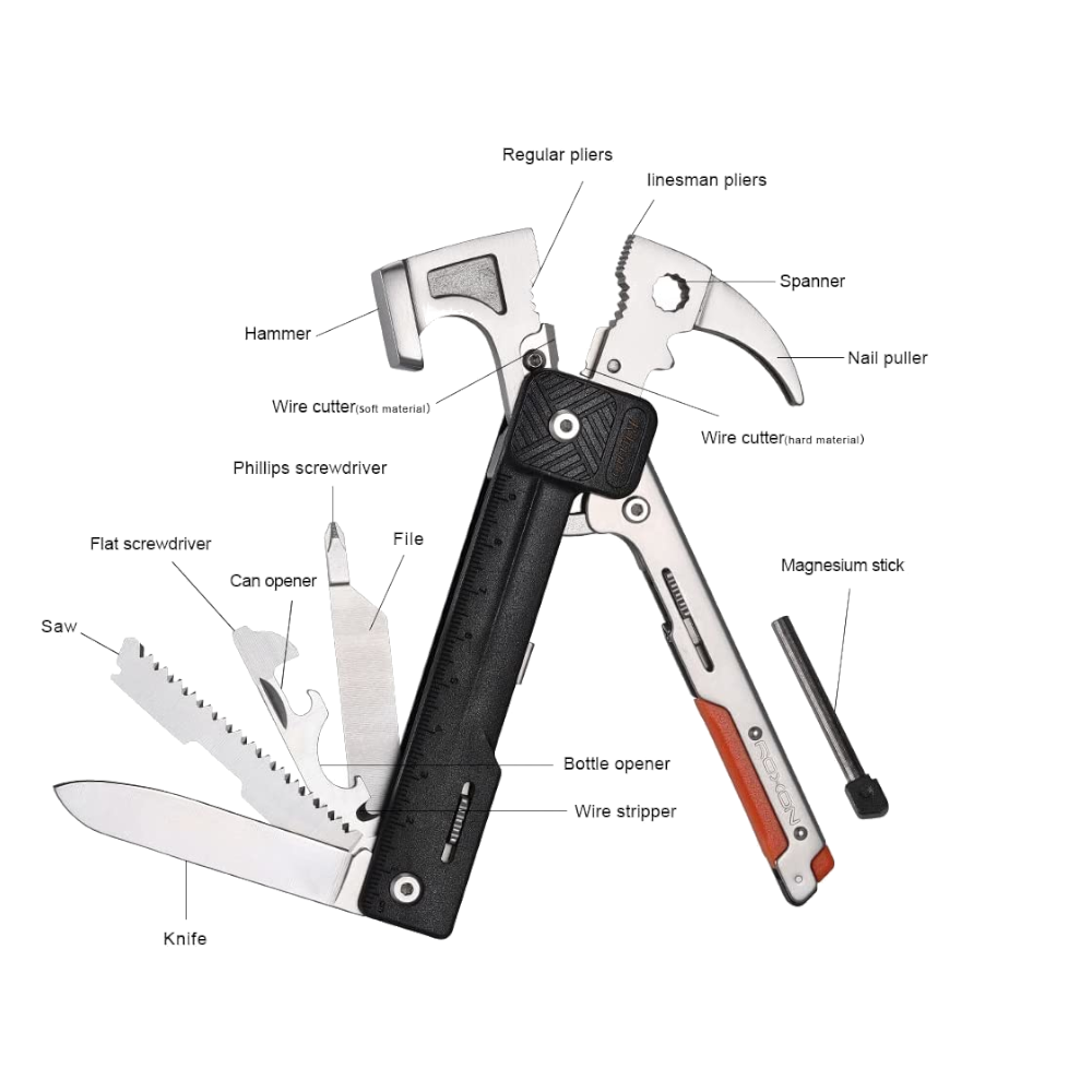 - INNOVATIVE and PORTABLE: 6 functions in one, such as fork, spatula, knife, tongs, bottle opener and wine corkscrew. It's pretty compact when stored, relatively sturdy when assembled and the tongs are long enough to get the job done while remaining compact.