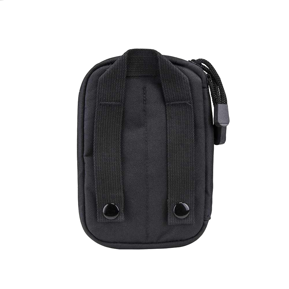 - Two zippers with cord zipper pulls and a small carry handle strap on the pack of the pouch.